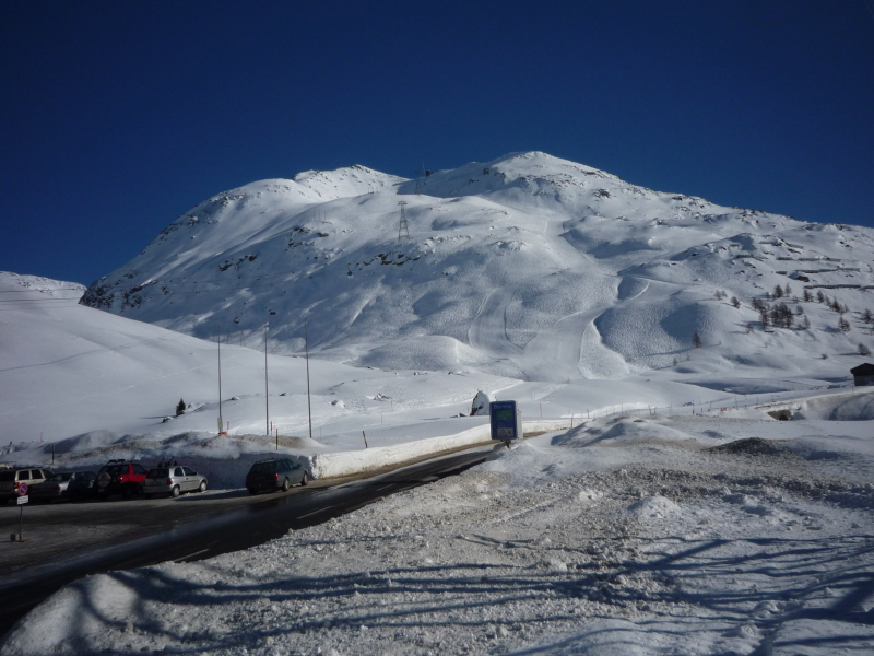 Lagalb (2959 m) a főút melletti felvonó alsó állomásától; a főút menti tábla jelzi, hogy a Bernina-hágó (2330 m) járható (felfelé végig kétméteres hófal szegélyezi az utat)