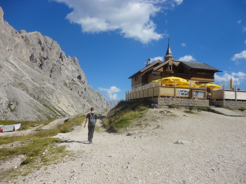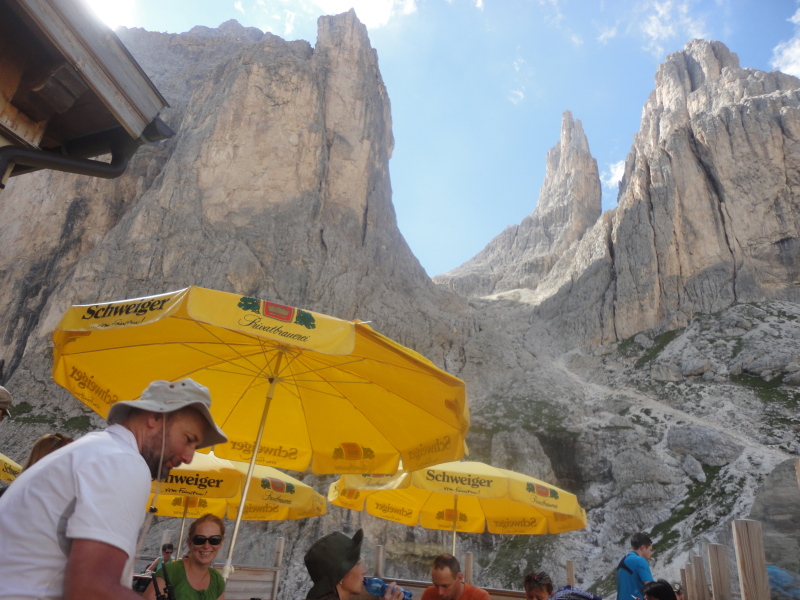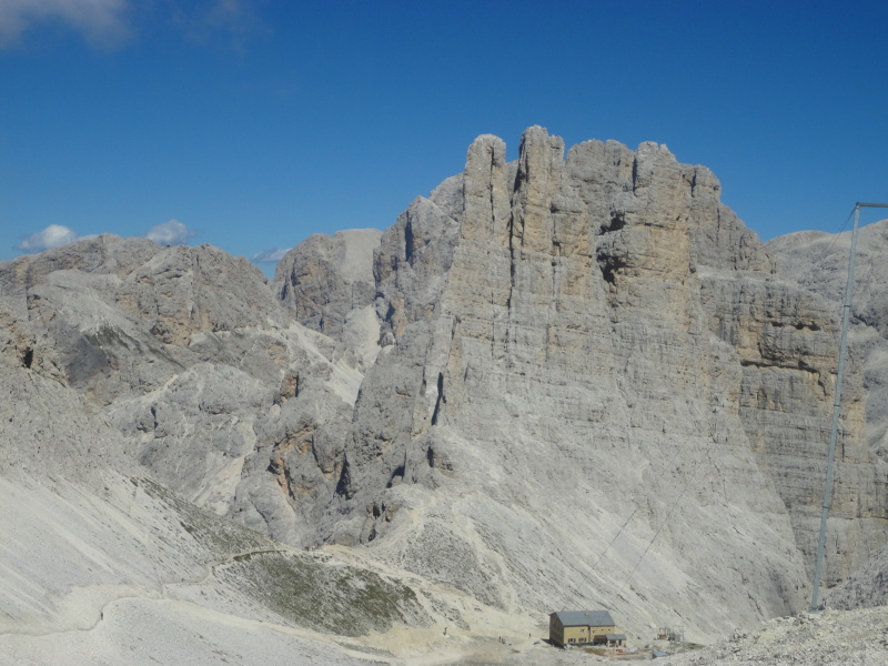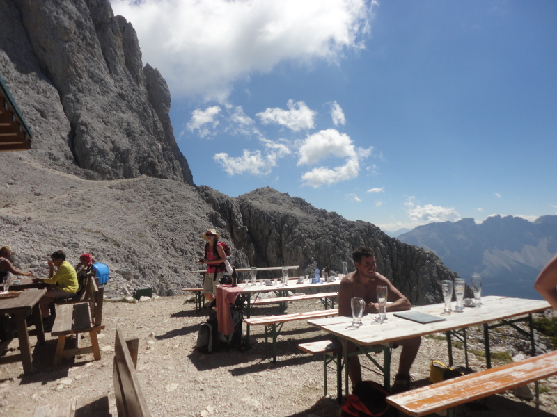 A Vajolet tornyok alatt az Alberto Hütte, gyalogtúránk 3. állomása. Innen már holdbéli tájon jutunk fel a Santner csúcsra.
