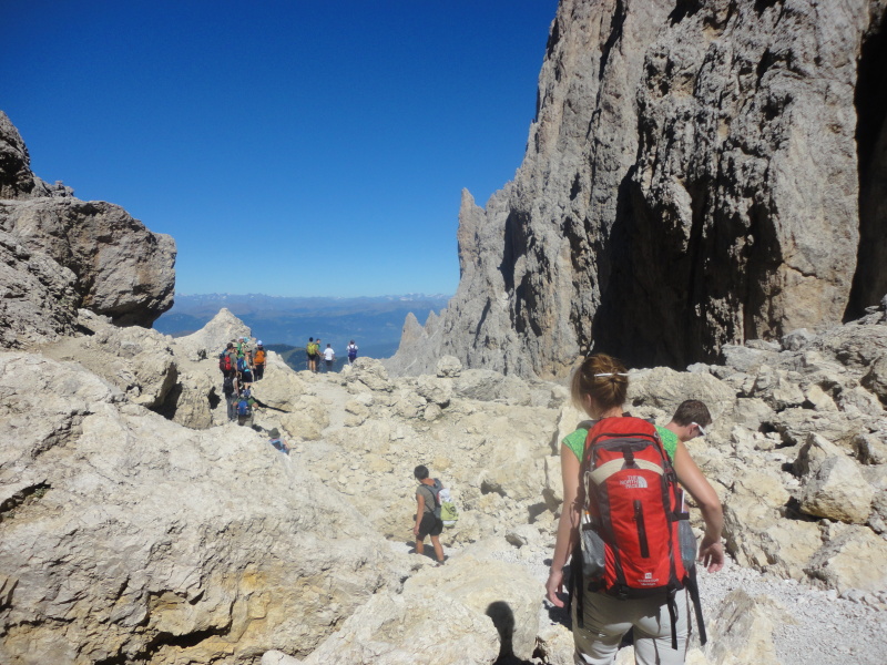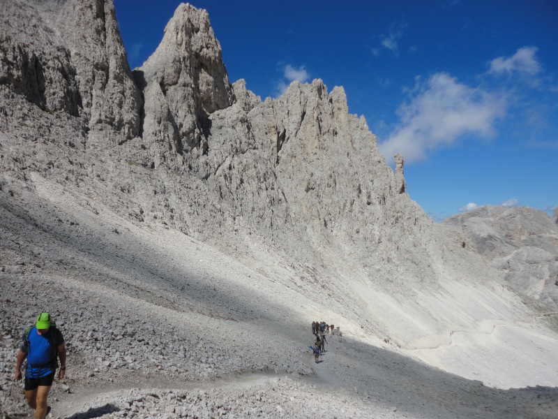 Kőtörmeléken vezet az túraút a Toni Demetz menedékháztól a Langkofelhüttéig.