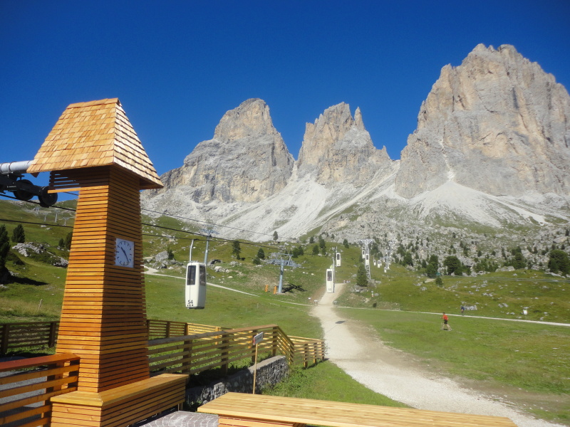 Ez a kapszulás felvonó visz fel a Langkofel szikláira, 2681 méterre. A kabinban két ember fér el állva, és érdekessége, hogy menet közben kell beugrani és kiugrani, persze két felvonókezelő segítségével. Na, ilyet még nem láttunk, élmény volt!