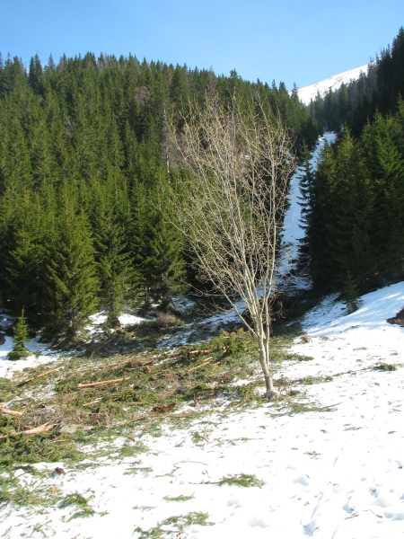 Lavina nyoma. A hó már elolvadt, csak a kidöntött fák láthatóak.