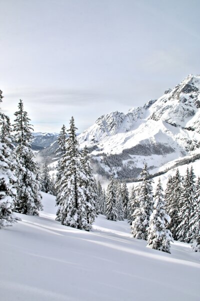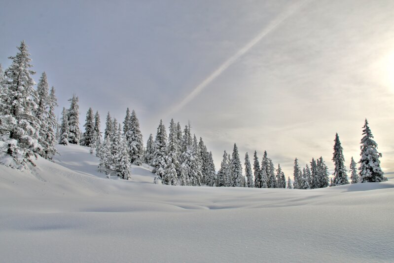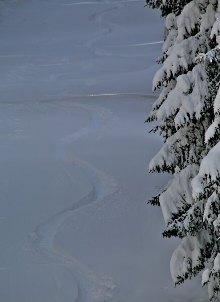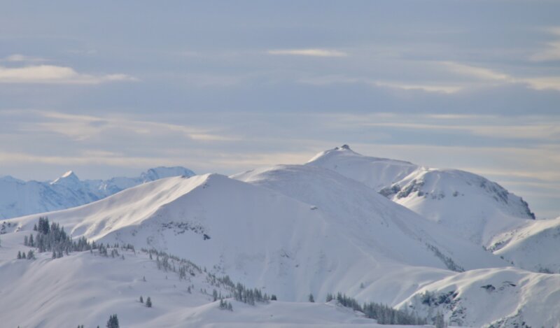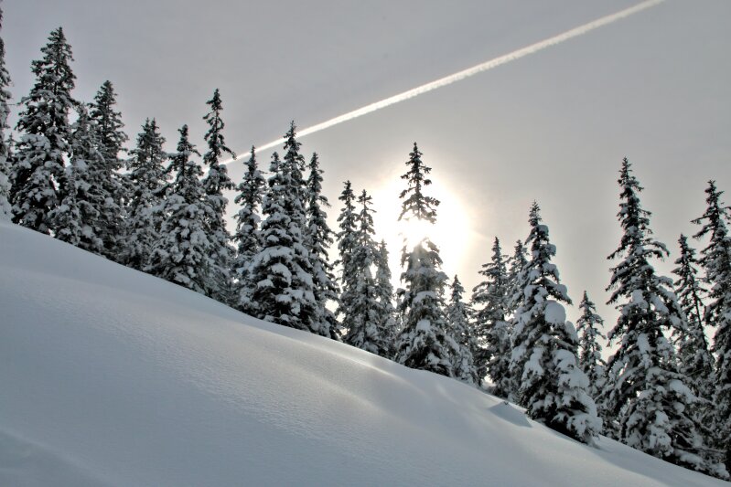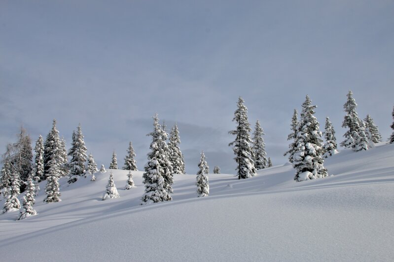 Hétfőre elszálltak a hófelhők és teret engedtek a napsütésnek, délután egy sítúra a mélyen behavazott fenyvesek közt a Hochkeilre
