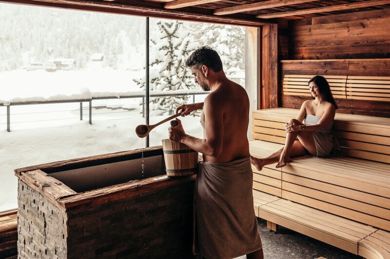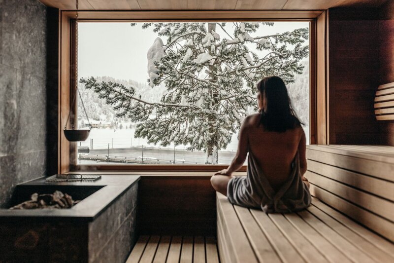 Panorámaszauna a Hotel Hochschoberben - téli kilátás a befagyott Turrachi-tóra