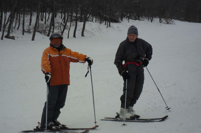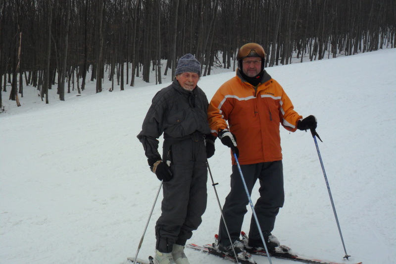 Az idén 100 éves Jenő bácsi és a cikk szerzője, Csabor a közös síelésen.