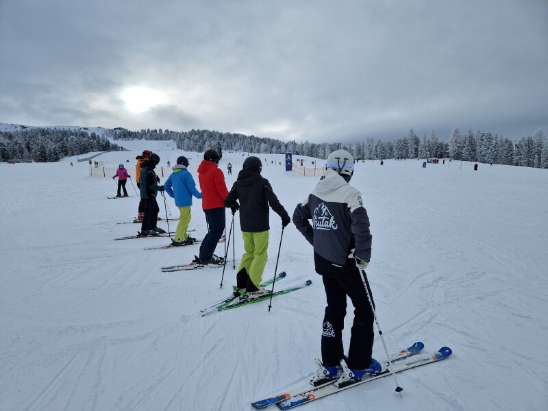 Közös bemelegítés a síelés előtt, Hodován Zsuzsanna csoportja a pártoló tagokkal