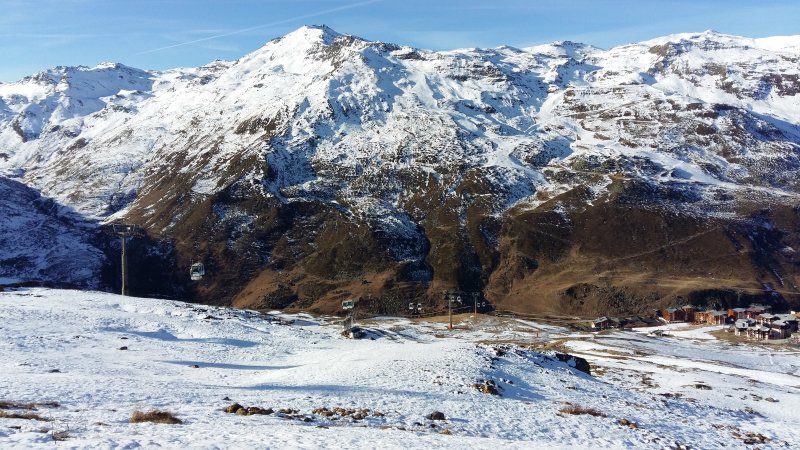 Gigantikus apartmanházak és szállodák Les Menuiresben | Ottjártunkkor az alsó részeken még nem volt természetes hó, viszont szépen behavazták a pályákat.
