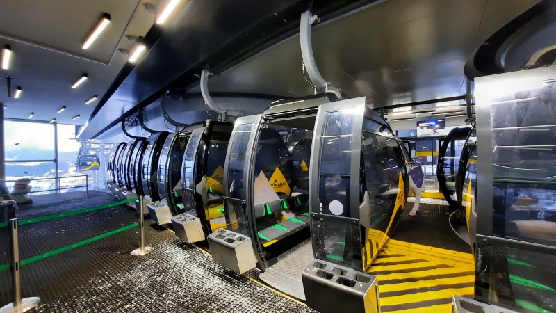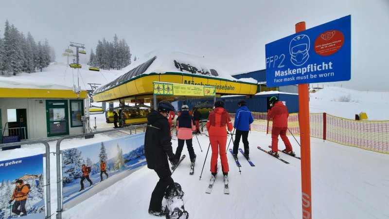 Kötelező FFP2-es maszkhasználatra figyelmeztető tábla a 8-üléses Märchenwiesenbahn felvonó előtt. Itt sem kellett sorba állni.