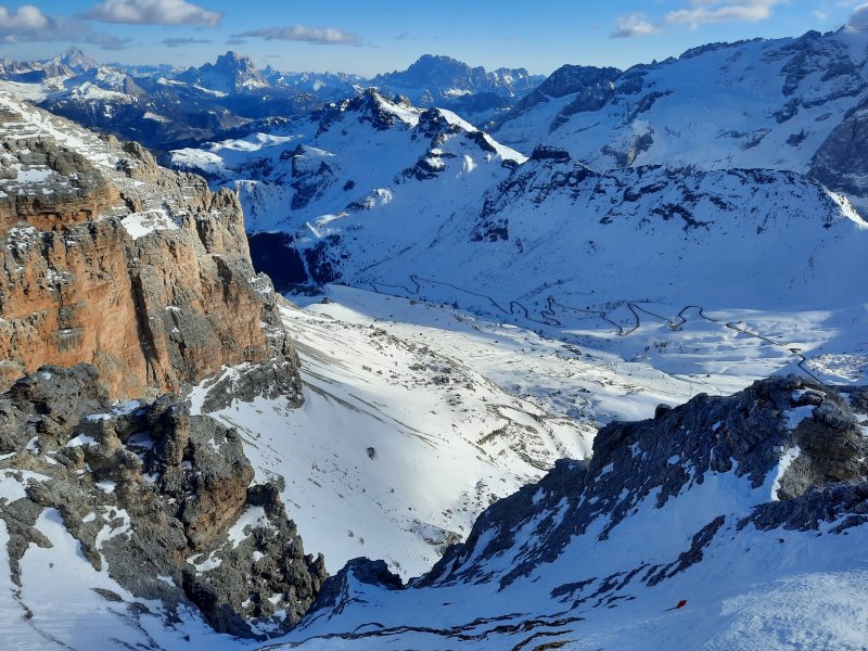 Kilátás a Belvedere sícentrumra a Sass Pordoiról.