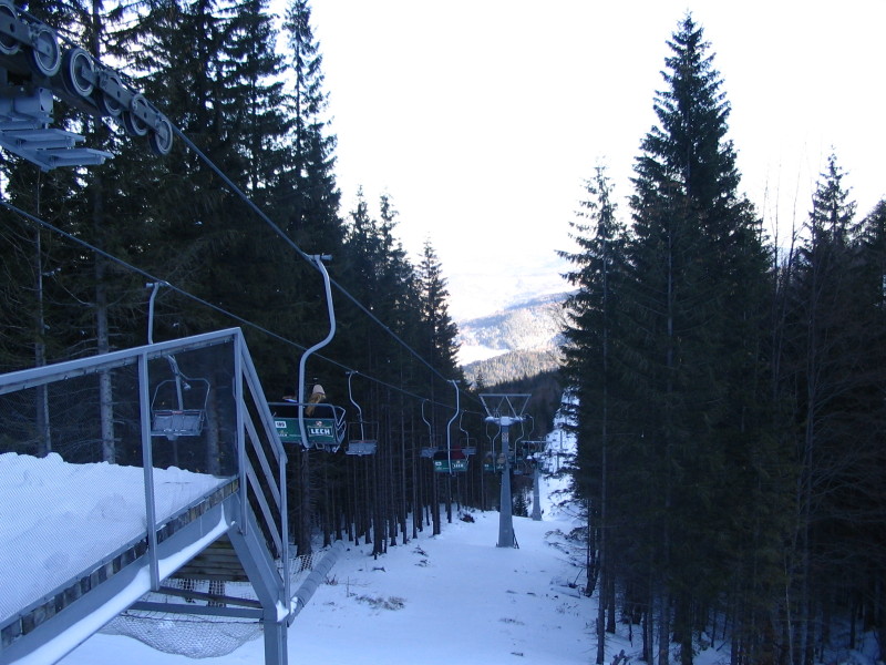 A 2-üléses felvonó Szczyrkben - Balra a gyönyörűen felújított Meta Hotel