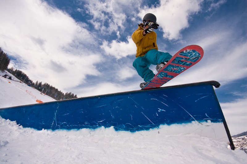 A fotót hason fekve készítettük, a pálya helyett az erdő szerepel a snowboardos mögött a háttérben, így jobban érvényesül a kanyar közben fröccsenő hó. A blendét nyitva használva a háttér elmosódott, így még jobban elkülönül a versenyző a környezetétől.