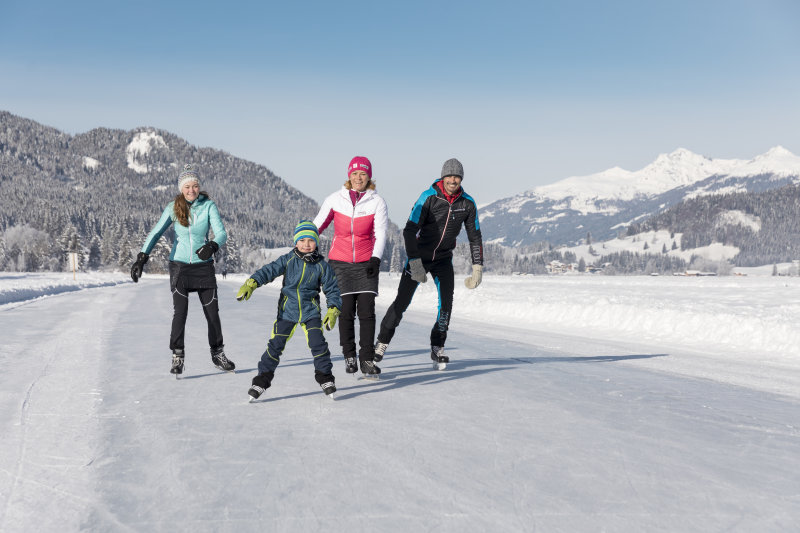 Korcsolyázók a Weissenseen - jobbra fenn látszik a sípálya is.