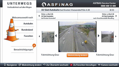 elérhetőek az ASFINAG webkamerái közvetlenül az okostévékről. Ezáltal az útra kelőknek megvan a lehetőségük, hogy akár közvetlenül az indulás előtt egyszerűen, a tv bekapcsolásával ellenőrizzék az aktuális közlekedési helyzetet Ausztriában.