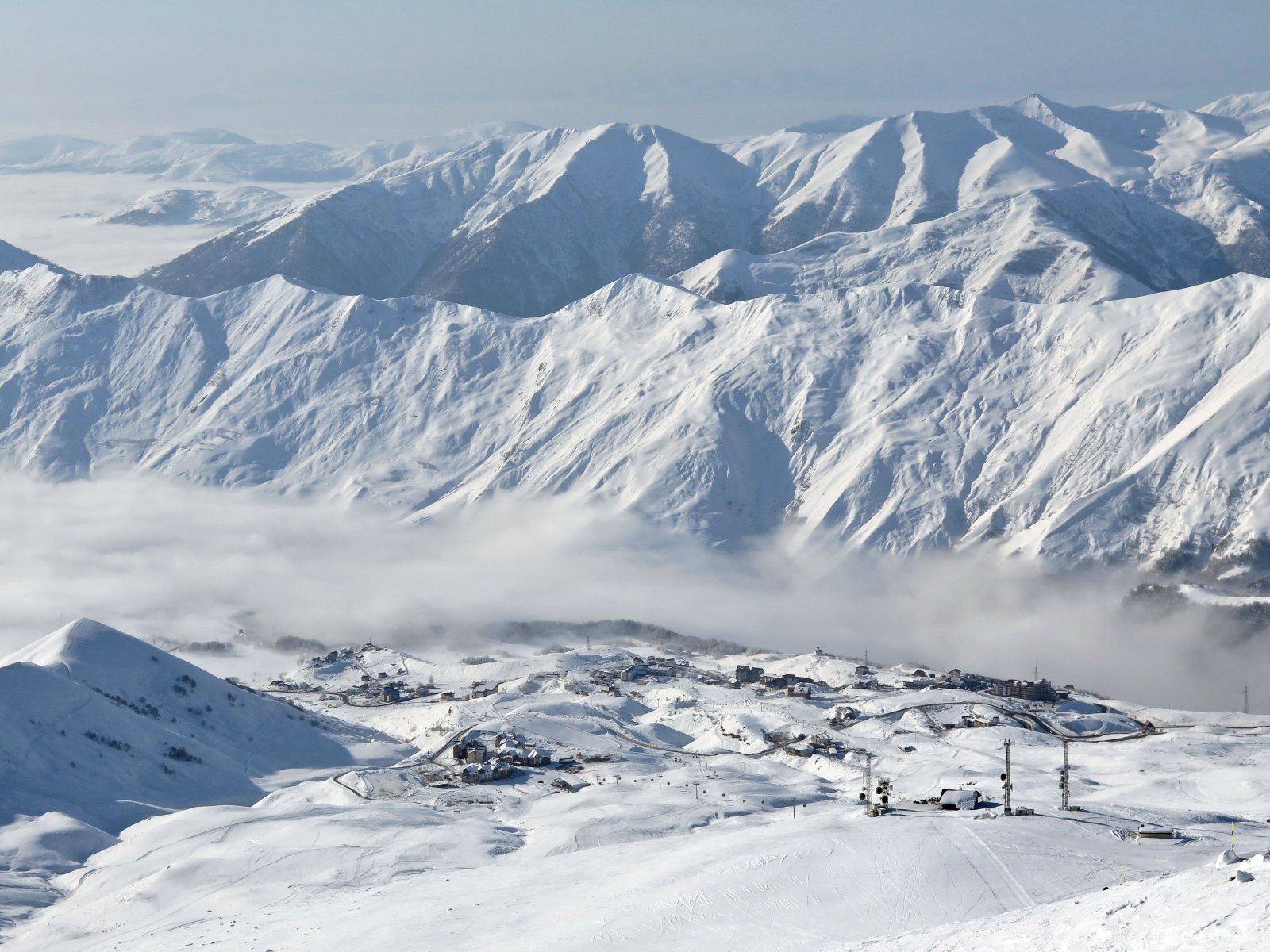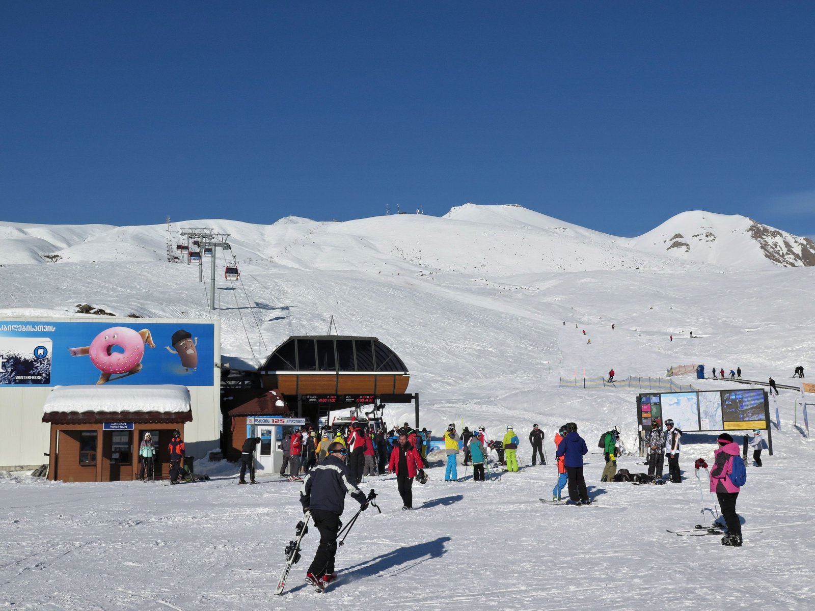 Hétfőn gyökeresen megváltozott minden. A grúzok hazamentek, szinte csak a külföldiek maradtak a pályákon. Könnyű őket felismerni a sítudásukról, illetve arról, hogy sisakot hordanak. Olyat helyin nem lát az ember. Üres pályákon, a völgyben húzódó felhőkből kiálló, napsütötte hegycsúcsok panorámáját és a tökéletesen sima pályákat élvezve örömsíztünk egész nap. Egy dolog rontotta csak a kedvünket, márpedig az, hogy a felvonók sebességét is a vendégek számához igazítottak. Spórolásból drasztikusan lelassították az ülőlifteket, a hegymenetek ideje a kétszeresére nő hétköznapokon.