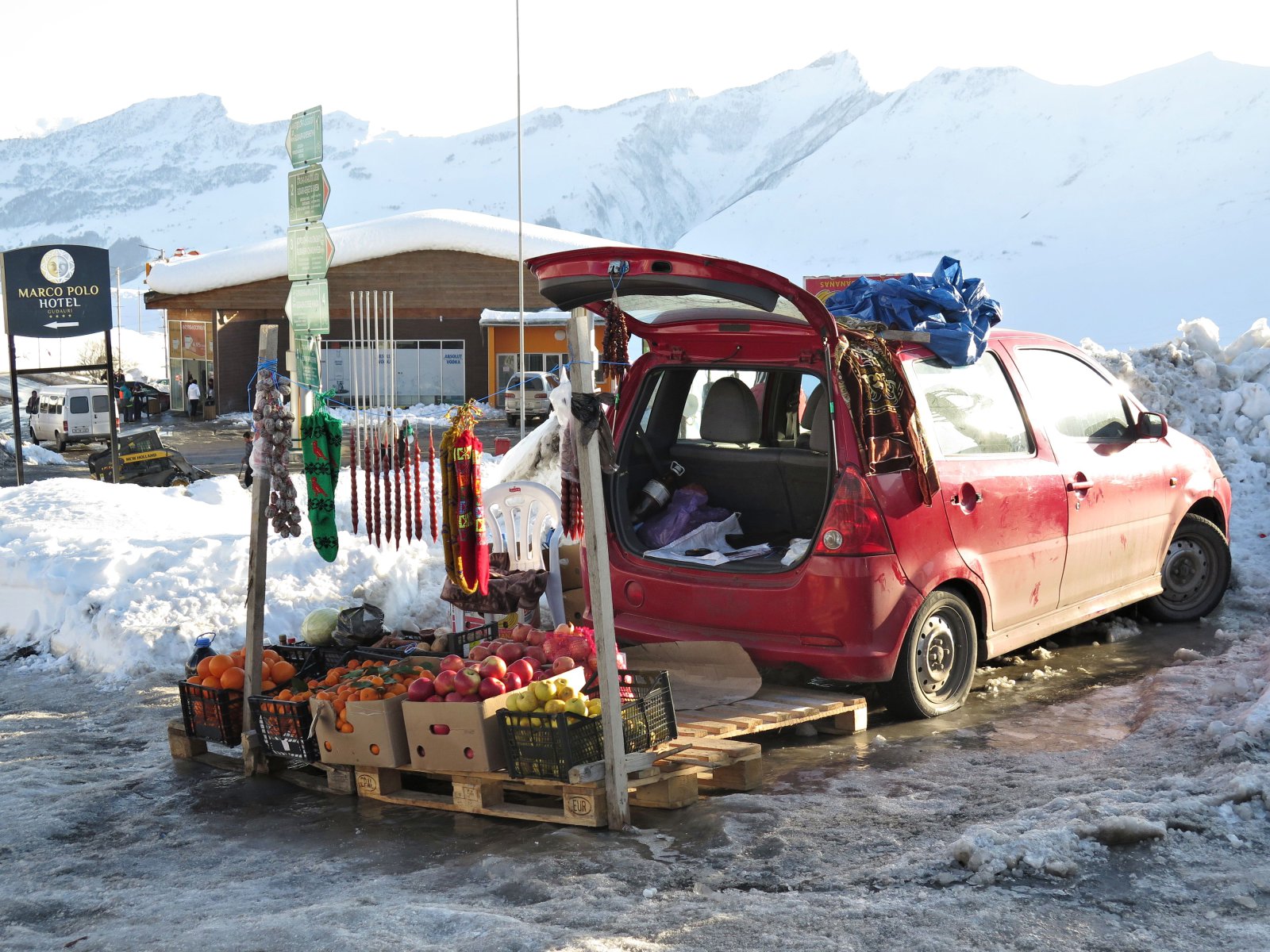 Ugyan háromszor álltunk meg tankolni – sofőrünk valamiért úgy gondolta, ha nem teli tankol, csak alkalmanként egy húszasért, akkor kevesebbet fogyaszt a busz – egyszer sem merült fel kérdésként, hogy bármilyen szükségletünk lenne-e, végül kalandos és küzdelmes hat és fél óra után megálltunk Gudauri központjában. Innen nem volt tovább, a kisbusz nem volt hajlandó minket házhoz vinni. Egy, nem ismerte a falut, kettő, a mellékutakat vastag jég borította.