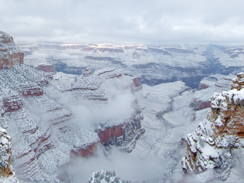 Ha csak néhány centimétertől is, de fehérlenek a Grand Canyon sziklái, ahogy ez a nemzeti park fényképén látható. A Grand Canyonban évente átlagban egy-két alkalommal hull a hó. A szurdok klímája jellemzően száraz, de a legmagasabban fekvő részeit könnyen be tudja borítani egy rövid havazás.