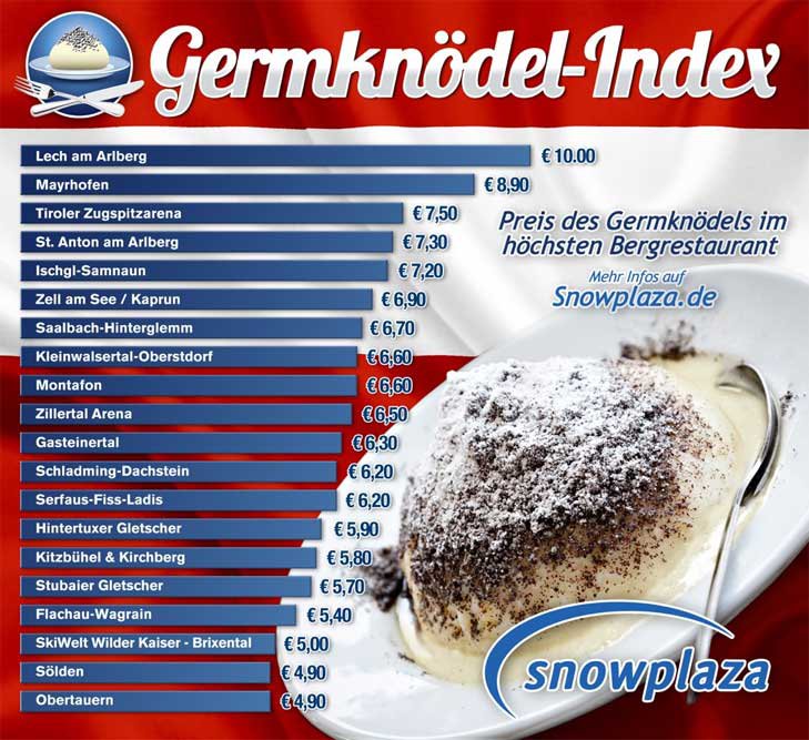 A Germknödel (magyarul gőzgombóc) nagyon sok síelő kedvence a tipikus osztrák hütték étlapjáról. Ezért választották ezt a Snowplaza "tudósai", hogy felmérhessék vele egy adott síterepen felmerülő nem előre eltervezett költségeket. Az összehasonlításban minden esetben a vaníliaszószos gőzgombóc ára szerepel, mégpedig 20 ismert osztrák síterep legmagasabb hegyi étterméből.