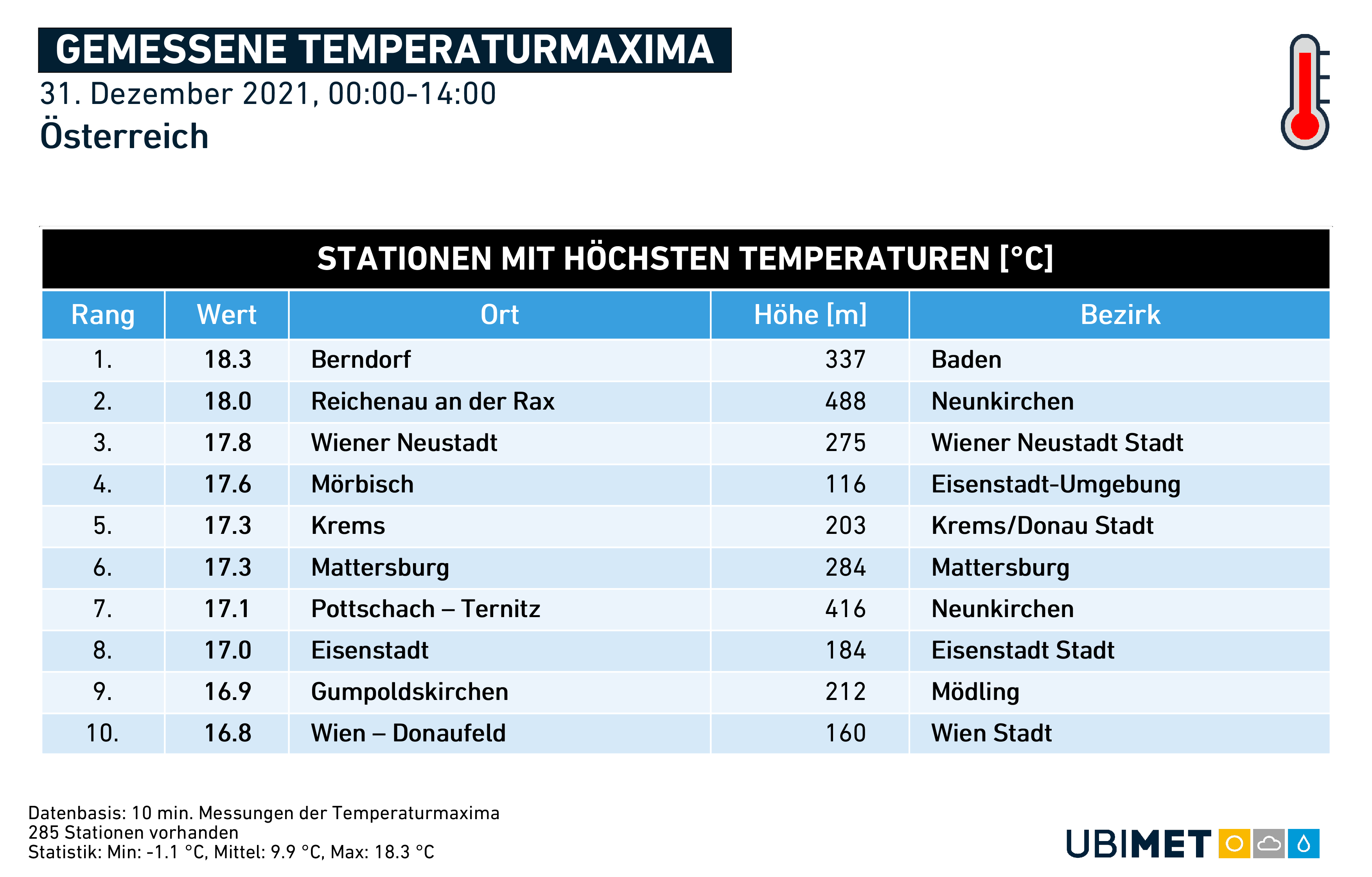 Ausztriában 2017. december 31-én mérték a napi maximumot eddig 17,6 fokkal. Ma ez is megdőlt, legalább négy mérőállomáson mértek ennyit vagy melegebbet.