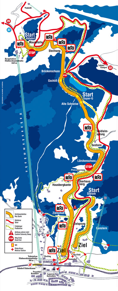 Fontos, hogy jó legyen az időjárás, hiszen egyből a rajt után található az egérfogó, vagyis a Mausefalle, amely egy meredek szakasz ugratóval, itt 50-80 méteres ugrással kezdenek a síelők. Rossz idő esetén, sajnos ez a rész kimarad a versenyből. Az ugrásból a síelők egy S-kanyarba érkeznek (Karusell), majd egy újabb meredek szakasz, a Steilhang következik. Utána viszonylag egyenes szakaszok következnek, a Brückenschuss, Gschöss és az Alte Schneise. Általában az utóbbitól indul a Super-G verseny, amelyet pénteken rendeznek.