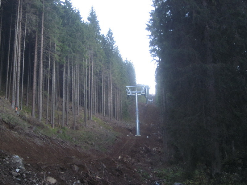 Ahogy a képen is látható, szép kis irtást kellett végezni az erdőben, hogy az új lift nyomvonala a parkolótól felérjen a kék 5-ös, a 43-as síút és a piros 11-es pályák találkozásához. Itt egy vendéglő is épül majd.