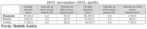 Ausztria a vendégéjszakák terén 3,6%-os növekedést tudott felmutatni a 2011/2012-es téli szezonban, ami összesen 64,3 millió vendégéjszakának felel meg. Ez 2,25 millió vendégéjszakával több, mint a 2010/2011-es téli szezon eredménye. A belföldi vendégéjszakák száma 3,1%-kal összesen 15,4 millióra nőtt, míg a külföldi vendégéjszakák 3,8%-kal összesen 48,9 millióra nőttek. A kitűnő számok mögött elsősorban az erős november, január és február, valamint a legnagyobb növekedést produkáló április hónap (16,2%-os növekedés, 7,44 millió vendégéjszaka) áll.