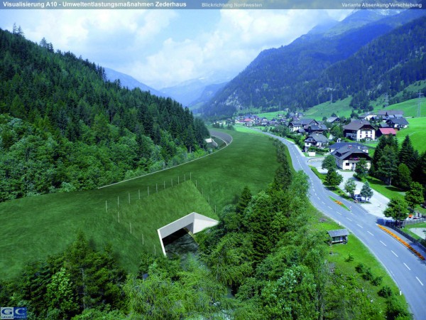 A Salzburg tartományban található Zederhaus településnek az A10-es (Tauernautobahn) autópályát üzemeltető Asfinag cég már korábban megígérte, hogy mindent megtesznek majd a zajártalmak csökkentésére. Az ígéretet tettek és tervek követték, valamint október közepén megtörtént az ünnepélyes kapavágás és elkezdődhet egy többéves, látványos építkezés. Ahogy a képen is látható, az autópályát teljesen elrejtik a szemek elől, hangszigetelő anyagokból teljesen befedik, mintha egy hatalmas zöld alagútban folytatódna az autópálya ezen a részen.