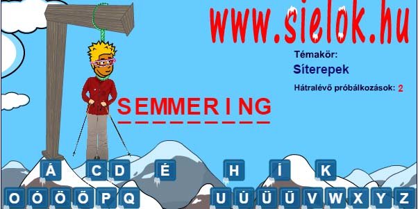 A klasszikus akasztófa játékban a feladat síeléssel, síoktatással kapcsolatos szavak, kifejezések, síterepek nevének kitalálása. Kicsit retró játék, több mint 10 éve készült, de meghagytuk, mert a visszajelzések alapján szeretik látogatóink.