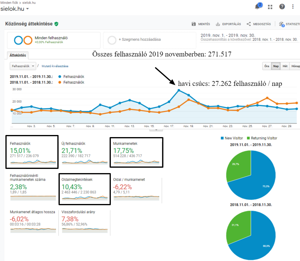 A 2019-es év végén rekordokat döntött meg sielok.hu látogatottsága. Novemberben 271.517, decemberben pedig 398.563 látogatást mértünk, ami a tavalyi évhez képest 10-15 %-os növekedést jelentett. Mutatjuk a grafikonokat, az adatok forrása a Google Analytics webstatisztikái.