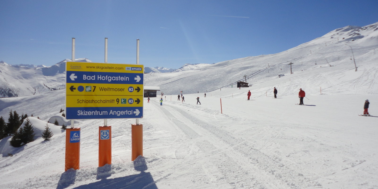 Pár hosszú csúszással már délre sikerült leamortizálni a combizmaim, így jól esett az ebédszünet, aztán folytattuk a síterület felfedezését a szemközti oldalon. A Schlossalm talán még impozánsabb, itt egybefolynak a lejtők, gyakorlatilag az egész hegyoldal egy végtelen hómező, akár egy gleccser. A Hohe Scharte 2300 méteres csúcsáról indul a sírégió leghosszabb lesiklópályája: egy 10 km-es piros, ami Bad Hofgasteinben ér véget, és 1400 méternyi (!) szintkülönbséget hidal át. A visszajutás csak 3 átszállással lehetséges, ezért ezt a menetet ajánlott a nap végére hagyni.