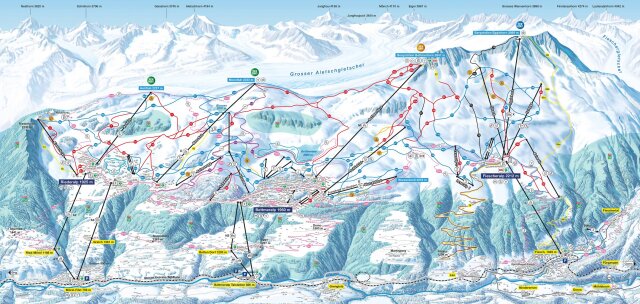 Három korábban különálló síterep: Riederalp, Bettmeralp és Fiescheralp összekötésével alakult ki a több mint 100 kilométeres pályarendszerrel rendelkező Aletsch Aréna. A völgyből kabinos felvonóval juthatunk fel a pályarendszer aljához: 1900-2000 méter magasan helyezkednek el a barátságos kisebb-nagyobb faházakból álló üdülőtelepek, garantáltan autómentes, békés környezetben. A liftek közel 3000 méter magasságig visznek fel, a panoráma lélegzetelállító. Egyik irányban a csúcsok karéjából a Mont Blanc és a Matterhorn integet nekünk, másik irányba tekintve Európa leghosszabb gleccserét, az Aletsch gleccsert csodálhatjuk, ahogy komótosan kanyarodik a négyezres hegycsúcsok közül a völgybe. A gleccser valamint a környező erdők az Unesco Világörökség listáján szerepelnek. Akár télen, akár nyáron felemelő élményt nyújt a csodás környezet.