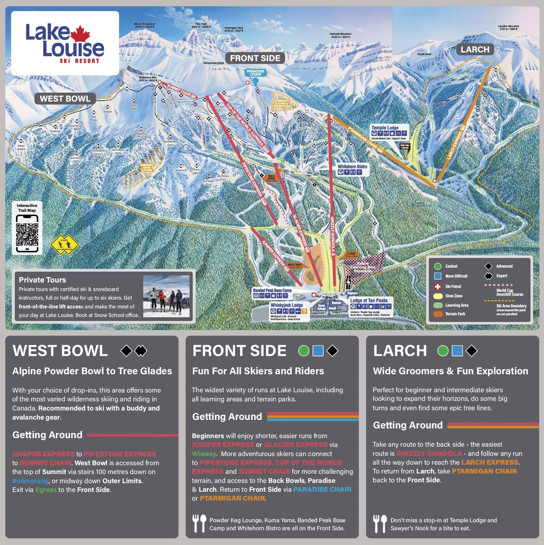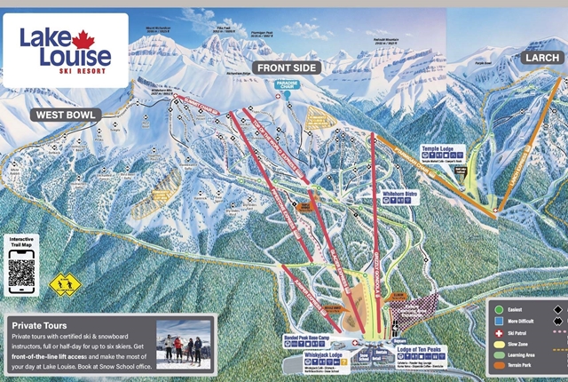 Lake Louise a legnagyobb síterep a környéken. A 2672 méter magas Mount Whitehorn csúcsa közelében található gerincről átlátunk a Powder Bowls részre, ahol a legtöbb dupla fekete pályát találjuk. A dupla fekete Kanadában mindig meredek, kezeletlen, de jelölt pályákat jelent. Ezek a pályák elsősorban a gyakorlott síelőket vonzzák, azon belül is a freeride és mélyhó sízés szerelmeseit.