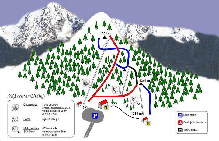 A csodálatos természeti környezetben fekvő Blidinje 1290-1551 méter magasságban terül el a vele megegyező nevű natúr park kellős közepén. A síterep kék, piros és zöld pályáit egy modern négyüléses felvonó és két húzólift szolgálja ki. A többi bosnyák síközponthoz hasonlóan itt is mérsékelt árak fogadják a síelőket, és a közeli szállások is kedvező árakkal csalogatják a vendégeket.