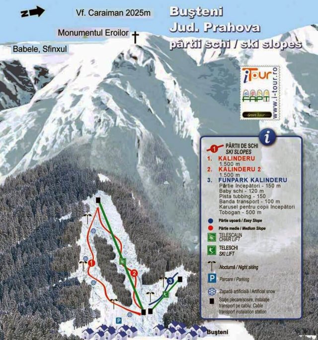 A "Domeniul schiabil Kalinderu" névre hallgató síterep a Prahova-völgyben található, közvetlenül Busteni hegyi városka szélén. A kb. 3 kilométernyi, közepes lejtésű sípályákat egy 4 személyes, lehajtható plexivel ellátott ülőlift szolgálja ki. A felső állomás mellett a tanulókat egy varázsszőnyeggel ellátott oktatópark segíti a tanulásban.