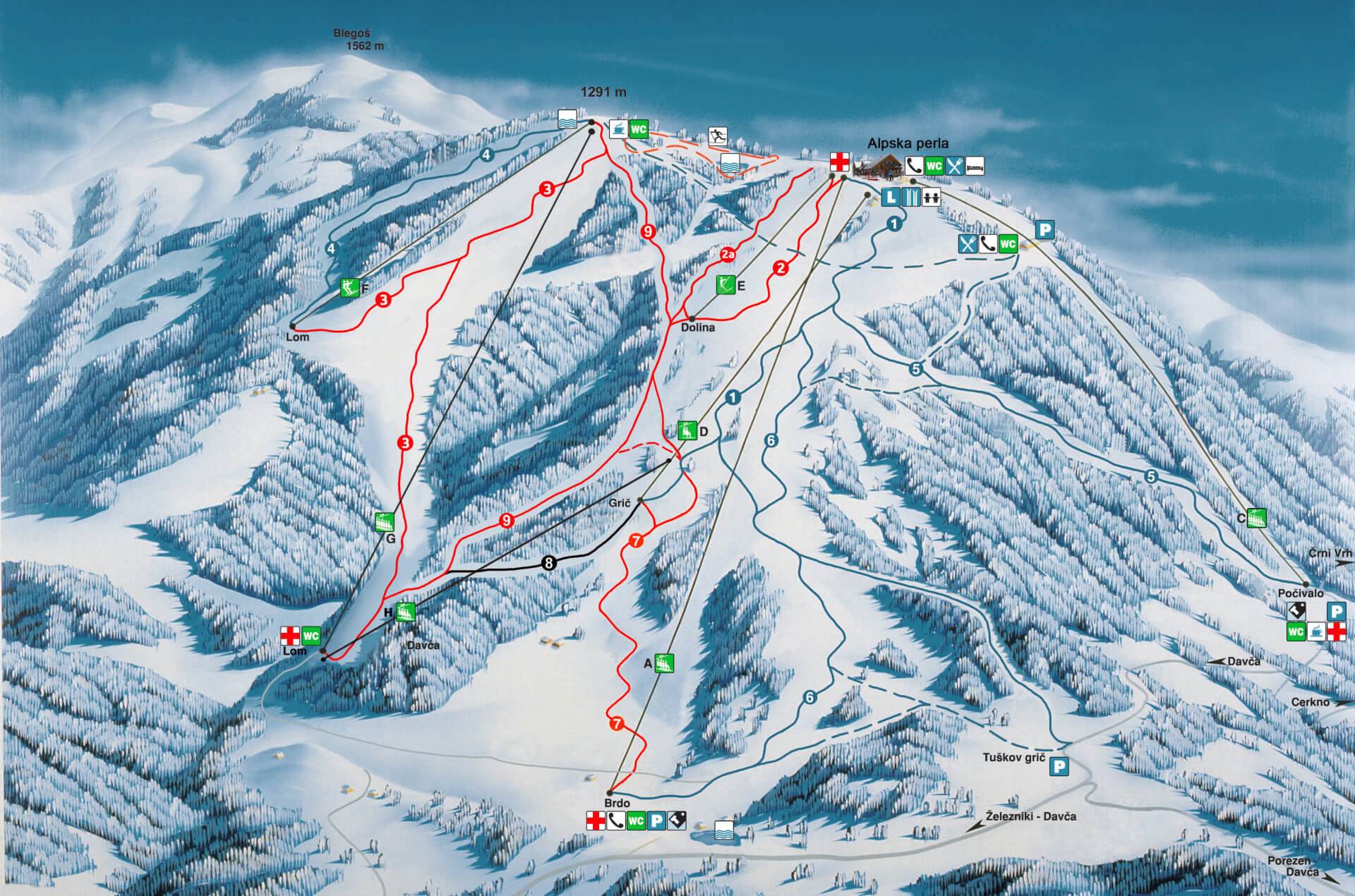 Modern síterep Cerkno településtől kb. 10 km-re és Ljubljana városától kb. 1 órás autóútra. Összesen hét felvonóval (két hatüléses, két négyüléses, egy duplaüléses és két húzólift) és 18 km sípályával rendelkezik. A völgyből egy egy négyüléses és egy hatüléses visz fel a hegyre. Ezeknek a hegyállomásánál könnyű pályák vannak, így ez különösen a kezdők és családosok számára ajánlható. Főként a csúcsról induló pályák között piros illetve fekete nehézségűek is találhatóak. A szezon december végétől március elejéig tart, a hóbiztosságról hóágyúk is gondoskodnak.