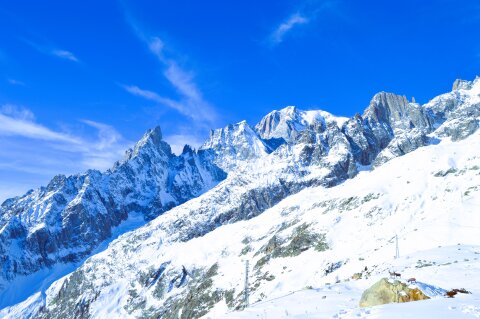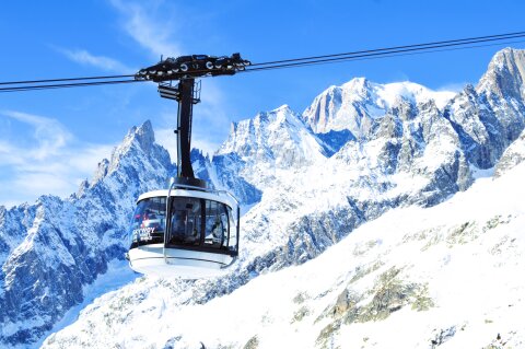 Aiguille du Midi 3843 méteres csúcsára vezet a kiskabinos lift egy közbenső állomással. Innen végül Chamonixba juthatunk le nagykabinos lifttel, ami két szakaszban mintegy 2800 méteres szintkülönbséget tesz meg!