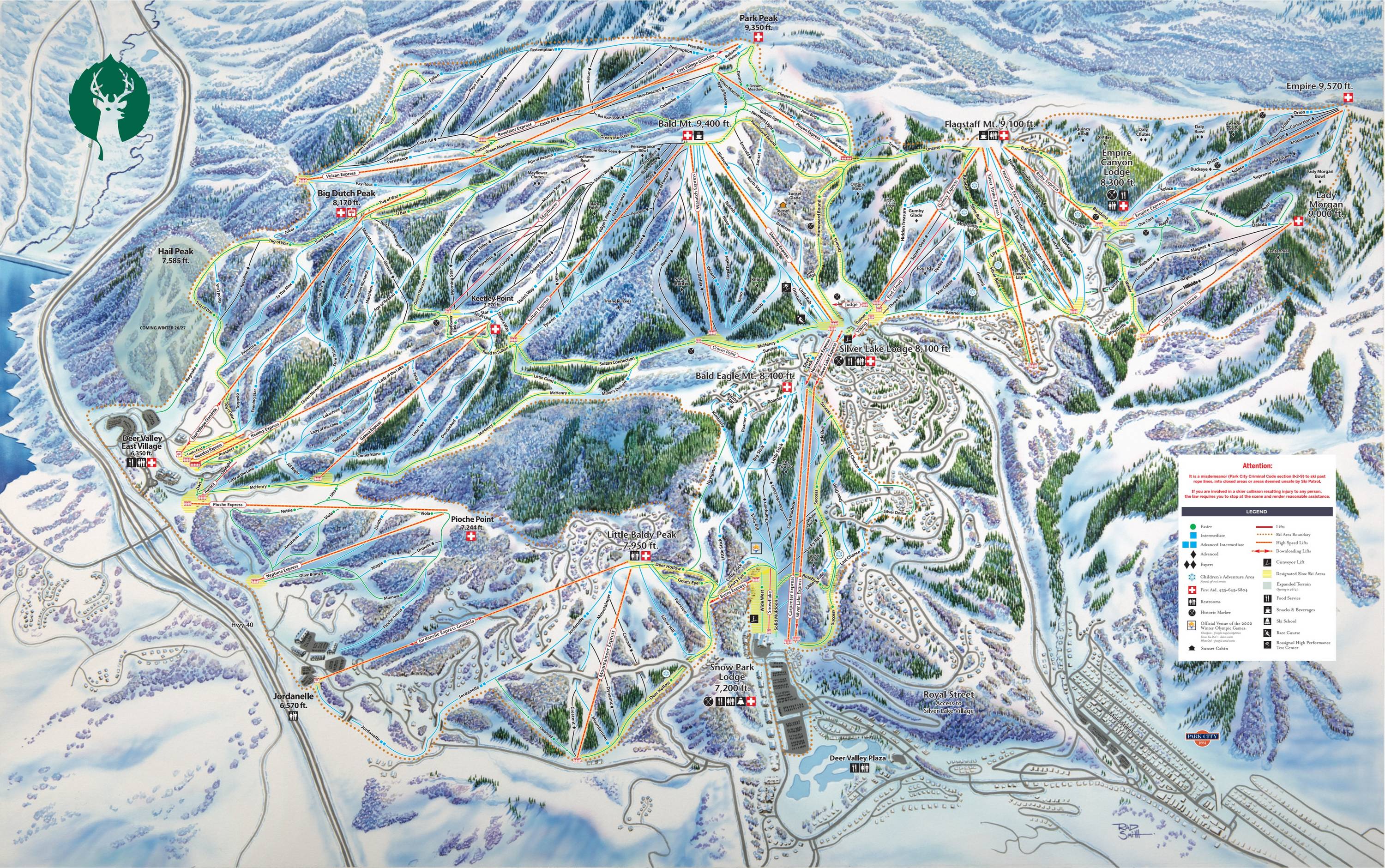 Deer Valley az USA egyik legexkluzívabb síterepének hirdeti magát, természetesen a luxusért cserébe mélyen a zsebünkbe kell nyúlnunk. A borsos napijegyért cserébe például a kabinos felvonónál külön személyzet segíti az utasok léceit elhelyezni a kabinok léctartóiba, így a sízőknek csak helyet kell foglalniuk és már utazhatnak is. A lesiklópályák fele közepes nehézségű.