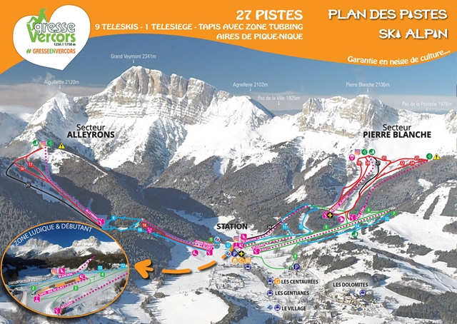 A 20 km lesiklópályával rendelkező síterep két jól elkülöníthető területre oszlik, és a felvonók aljánál el kell döntenünk merrefelé indulunk el: a Blavet húzós felvonóval az Alleyrons szektor, vagy a másik irányban a Pierre Blanche szektor felé. Az Alleyrons szektorban a már említett Blavet mellett még egy húzólift található, az Alleyrons, amely 1600 m-re viszi a síelőket, ahonnan egy piros és két fekete pálya vezet lefelé. A Pierre Blanche szektorban található a terep egyetlen ülőliftje, de a terep legmagasabb, 1730 m-es pontjára itt is csak húzólifttel lehet feljutni. Ezen a részen van a hópark, a különböző nehézségű boardercross pályák és egy – fizetős – szánkópálya is. A megfelelő hóminőséget egy 2011-ben átadott víztároló segítségével biztosítják a hóágyúk. A sífutóknak 5 pálya áll rendelkezésre, melyek összesen 43 km hosszúak, a hótalpas túrázás kedvelői pedig 10 különböző útvonal közül választhatnak. A város és a síterep között félóránként közlekedő síbuszjárat biztosítja az összeköttetést.