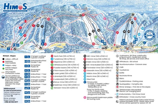 Himos Finnország déli részén található, Helsinkitől 220 km-re. 1995-ben és 2001-ben is az év síterepének választották. Szupercsővel, park- és streetpályával, egy boardercrosspályával és FIS szabványoknak megfelelő mogulokkal várja a síelőket és snowboardosokat.