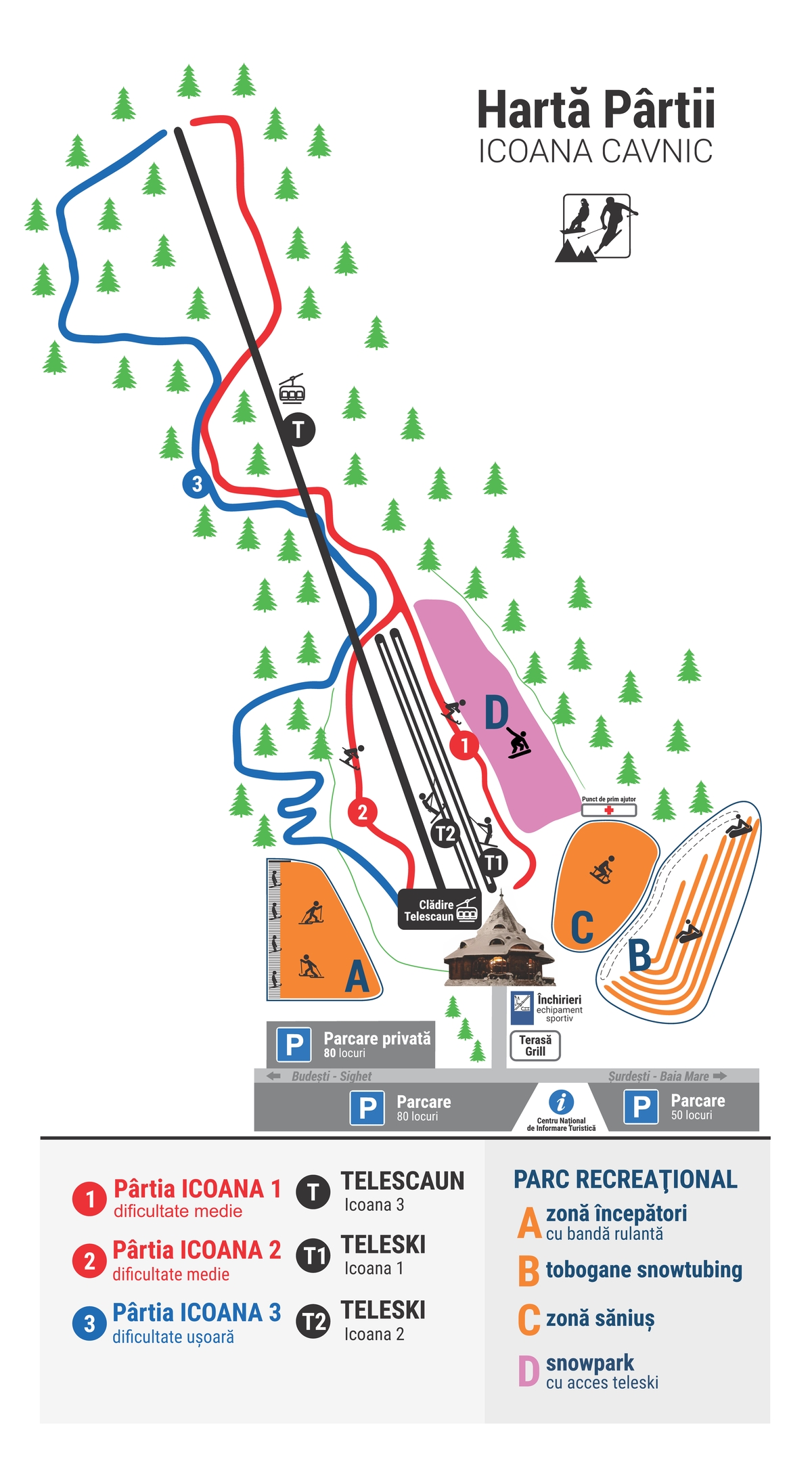Két széles pálya az alsó harmad, de van egy rövid kék kanyargós is a fák között. A jobb oldali pálya egyik részébe funpark lett építve.