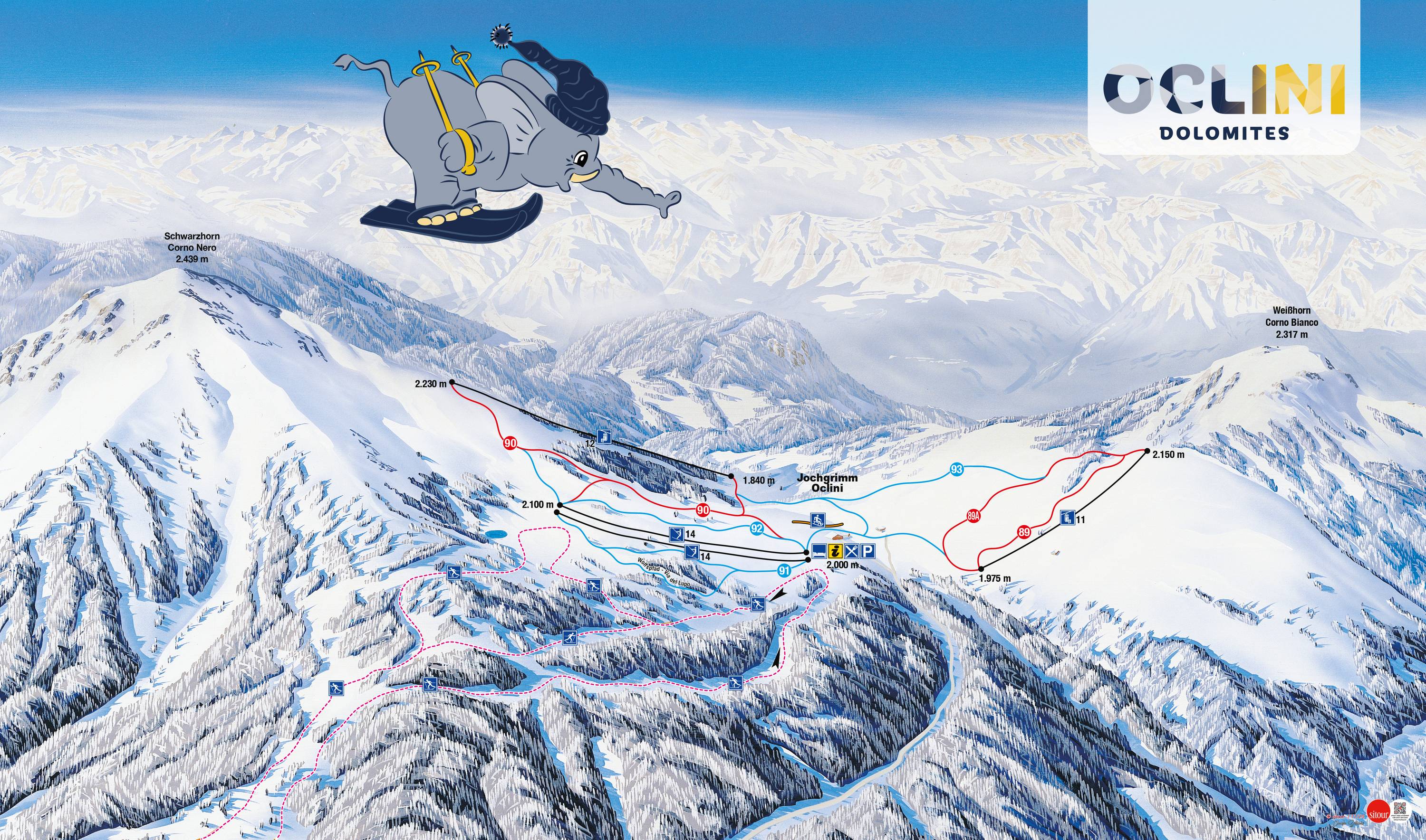 Jochgrimm - Oclini Olaszország egy kisebb síterepe, melynek legmagasabb pontja 2223 méter. 385 méter szintkülönbséggel és 7 km sípályával rendelkezik, melyből 500 m fekete, 3,5 km piros, 3 km kék. A pályarendszert összesen 4 darab felvonó szolgálja ki, közülük 2 ülőlift, 2 húzólift.