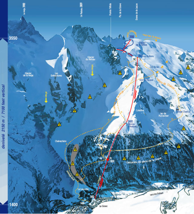 La Grave lejtői és liftjei tulajdonképpen a tekintélyes méretekkel rendelkező Les 2 Alpes sícentrum gleccserpályái "mögött" húzódnak. La Grave falu mellől, 1450 méteres magasságból indul a "gondola fűzér lift" és két közbeiktatott állomás után (az egyiknél ki is lehet szállni), mintegy 30 perces menetidő után ér fel 3200 méteres magasságba! Innen kizárólag kezeletlen pályákon lehet visszacsúszni a faluba, a 2100 méter alatti részeken már fák között csúszhatunk vissza.