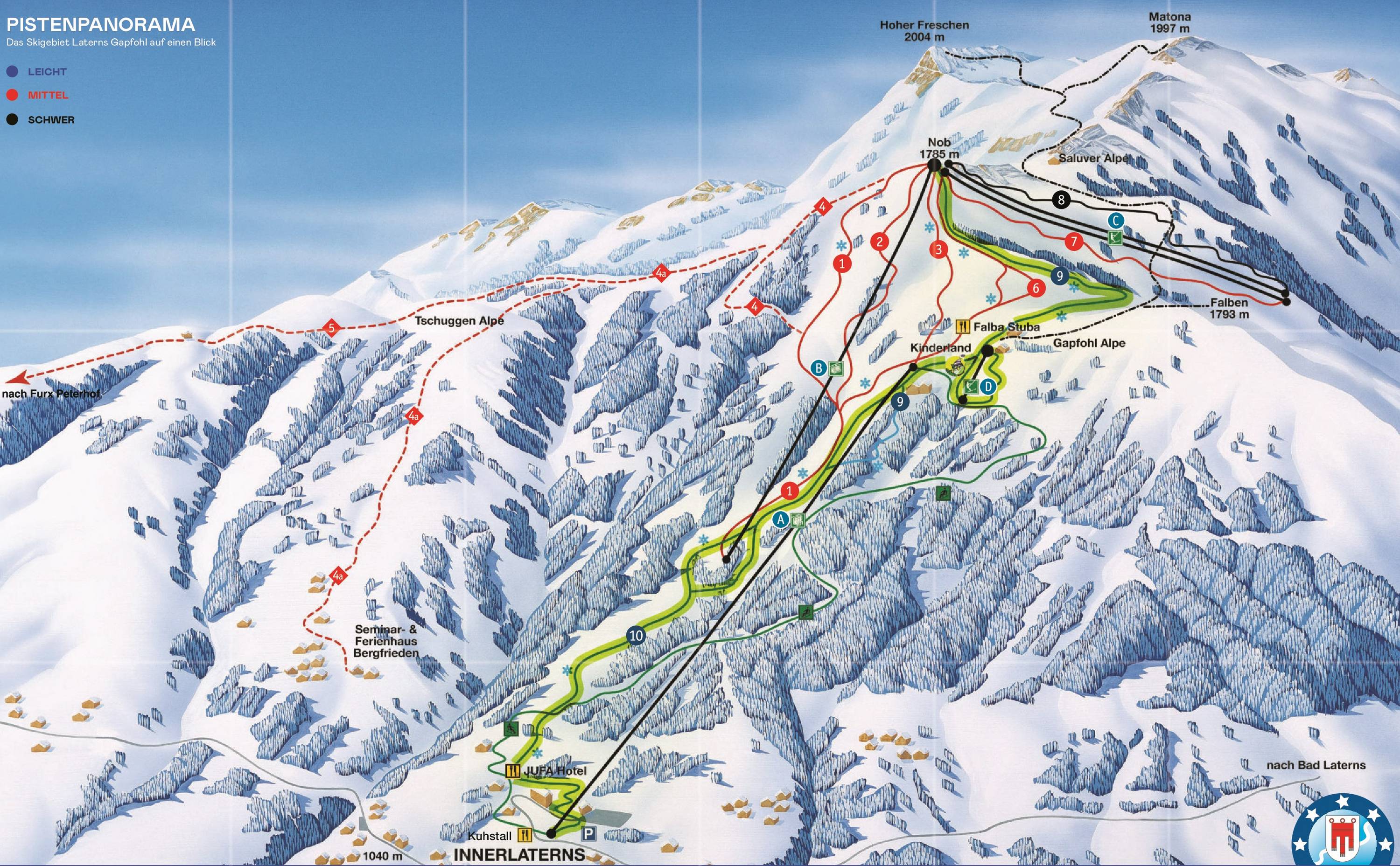 Kezdők számára a négyüléses fenti állomásnál egy varázsszőnyeg és egy tányéros felvonó üzemel. Leghosszabb pályája a Tschuggenabfahrt ami, Innerlaternsbe visz le. A hóágyúzásnak köszönhetően a szezon vége felé is jól sízhető az alsó szakasza. A gapfohli üléses tetejétől egy szép szánkópálya kanyarog le a völgyig 4 km hosszúságban.