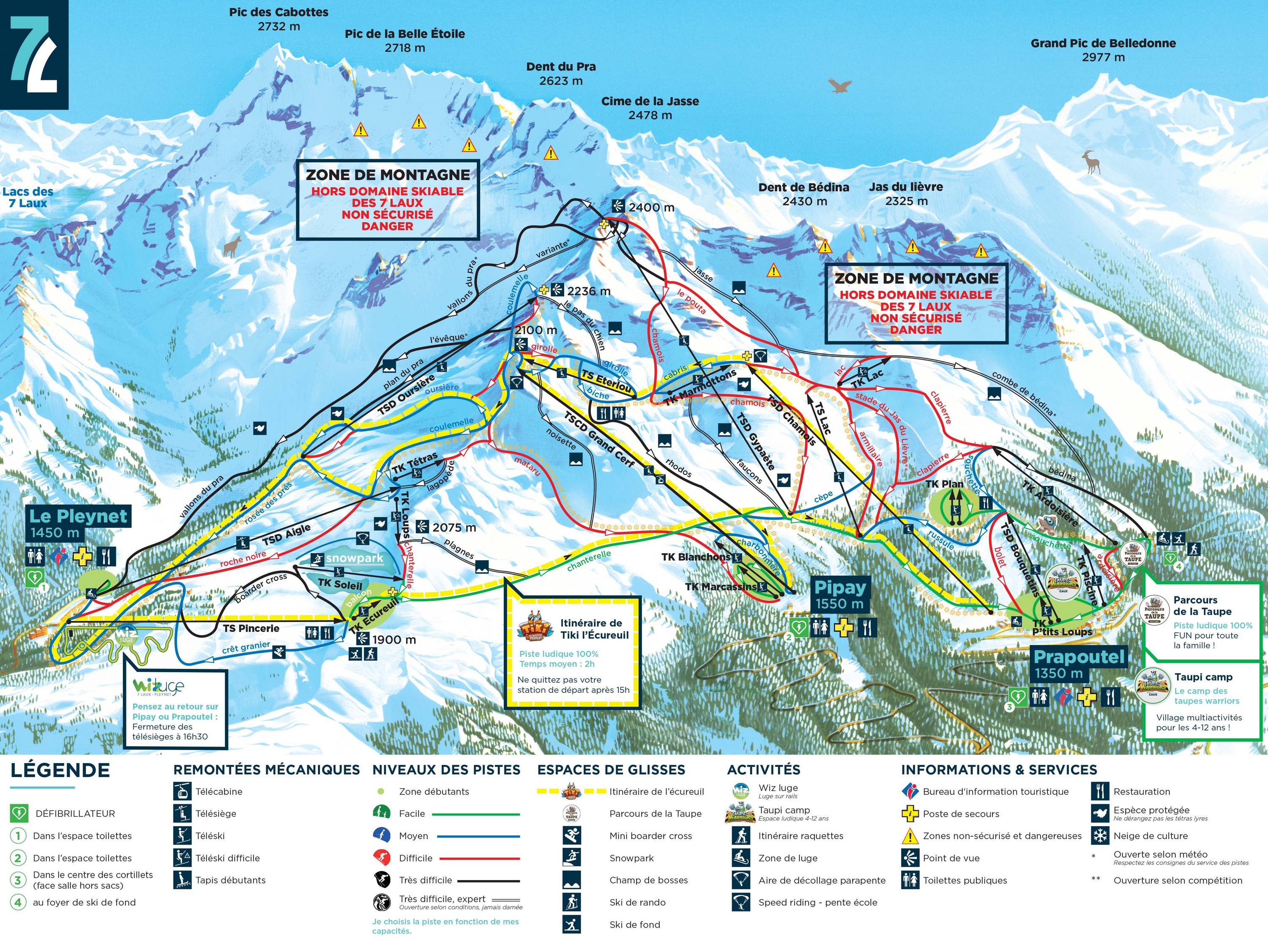 A hegyvonulat észak-déli irányú, ezért délelőtt és délután is találhatók napsütötte pályák, de van sok erdőhatár alatt futó pálya is. Prapoutelnél a kezdők sok könnyű pályát találhatnak, szép kilátással a Chartreuse és a Vercors hegységre.
