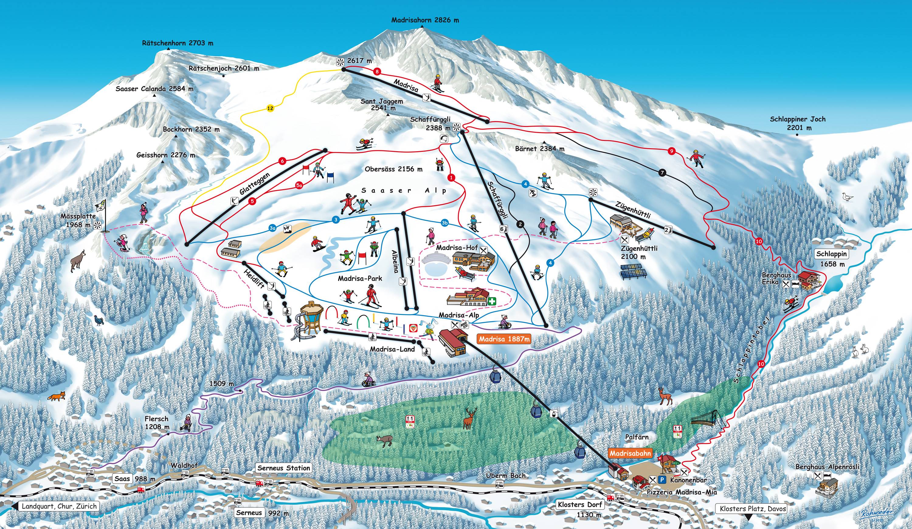 A Davos-Klosters sírégió egyike Svájc legnagyobb hagyományokkal bíró téli-nyári üdülőközpontjainak, ennek része a Madrisa. A síközpont szívében snowtubing, valamint hat éves korig ingyenesen igénybe vehető síjátszótér, mozgószőnyeg, és karusszel várja a gyerekeket. Itt található a "Madrisa Run" elnevezésű mintegy 8,5 km hosszú családi szánkópálya!