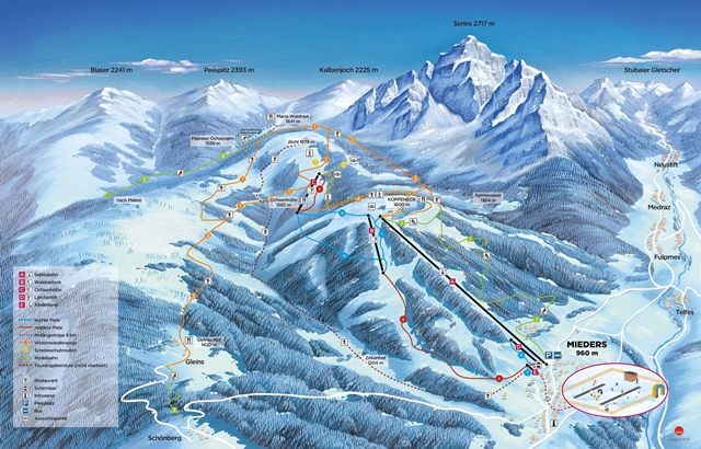 Mieders - Serles Ausztria egy kisebb síterepe, melynek legmagasabb pontja 1674 méter. 714 méter szintkülönbséggel és 5,7 km sípályával rendelkezik, melyből 3,5 km piros, 2,2 km kék. A pályarendszert összesen 5 darab felvonó szolgálja ki, közülük 1 kiskabinos lift, 4 húzólift.