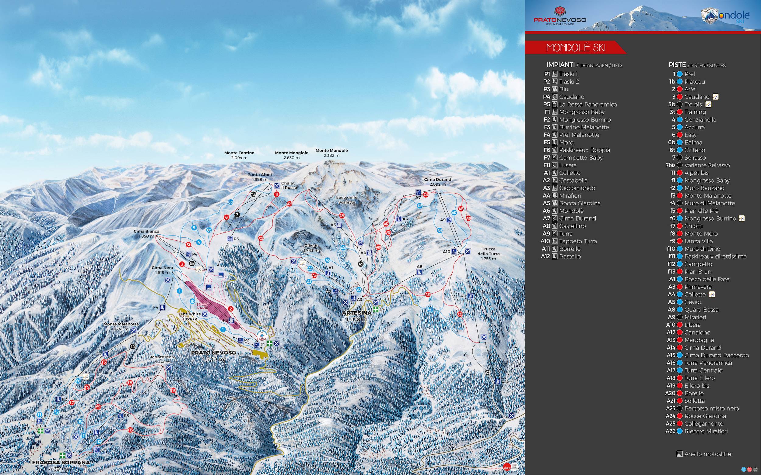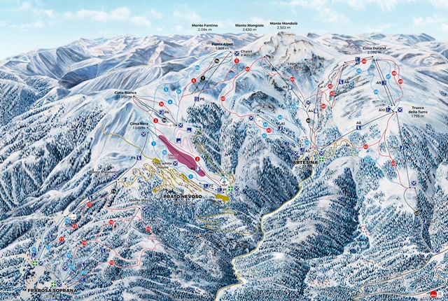 Prato Nevoso és Arestina a nagy francia üdülőtelepülések mintájára hozták létre, a befektetők közvetlenül a pályák tövében építettek fel nagy apartmanházakat. A legdinamikusabban fejlődő település Prato Nevoso, ahol sízés után számtalan szórakozási és vásárlási lehetőség várja a vendégeket. Ezzel szemben Arestina nyugodtabb hely, itt két nagy régi apartmanblokk uralja a látványt. A két település pályarendszereit az utóbbi években egyesítették, majd Frabosa Sottana pályáival is bővült a sícentrum, így mára már több mint 100 kilométernyi lejtőn sízhetünk lecsatolás nélkül.
