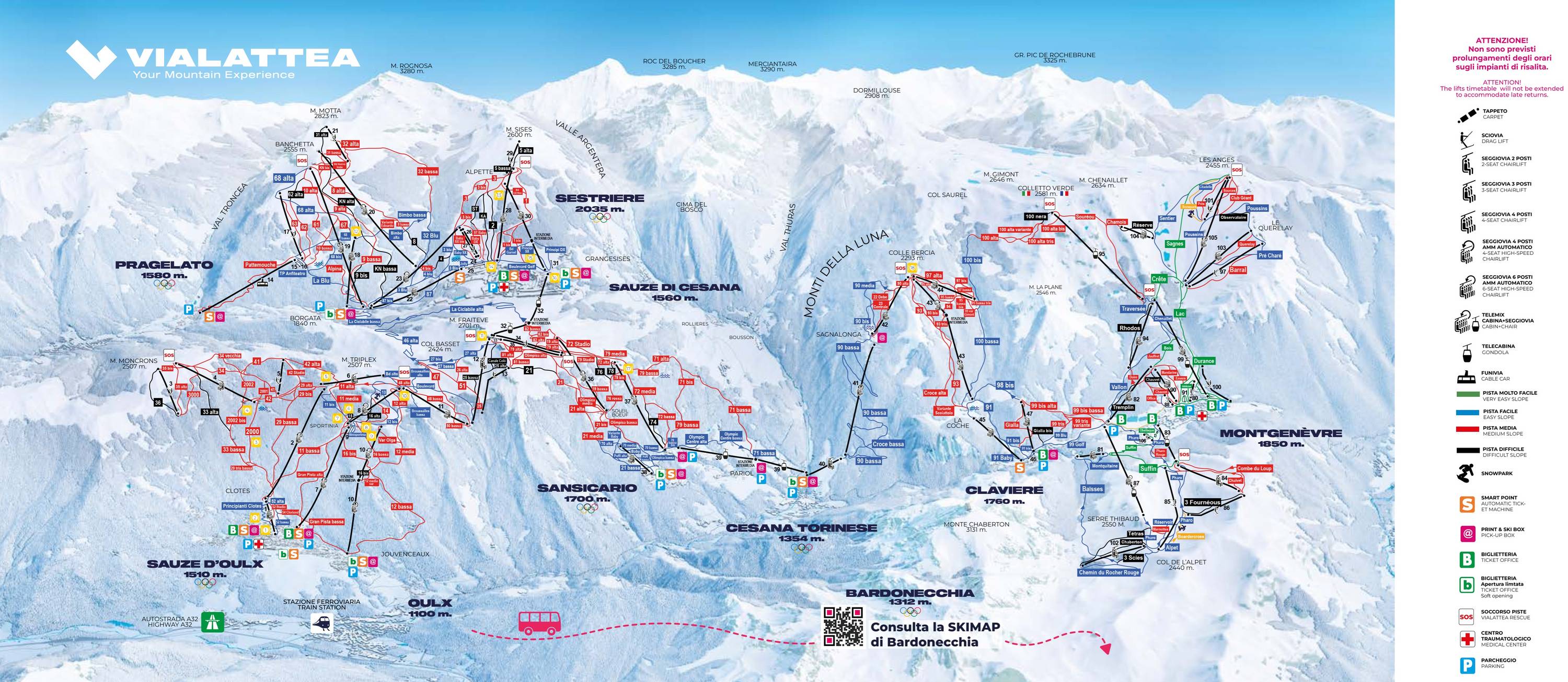 A modern liftrendszernek köszönhetően (főként négyszemélyes ülőliftek és kabinosok) jó az összeköttetés az egyes síterepek között - ennek ellenére érdemes korán kelni, ha a síterep egyik végéből a másikba el szeretne jutni és vissza. Az olimpiai alpesi sípályák (Kandahar Banchetta - Giovanni Nasi) Sestriére városka felett, a Monte Motta és a Mont Sies meredekebb lejtőin találhatóak.