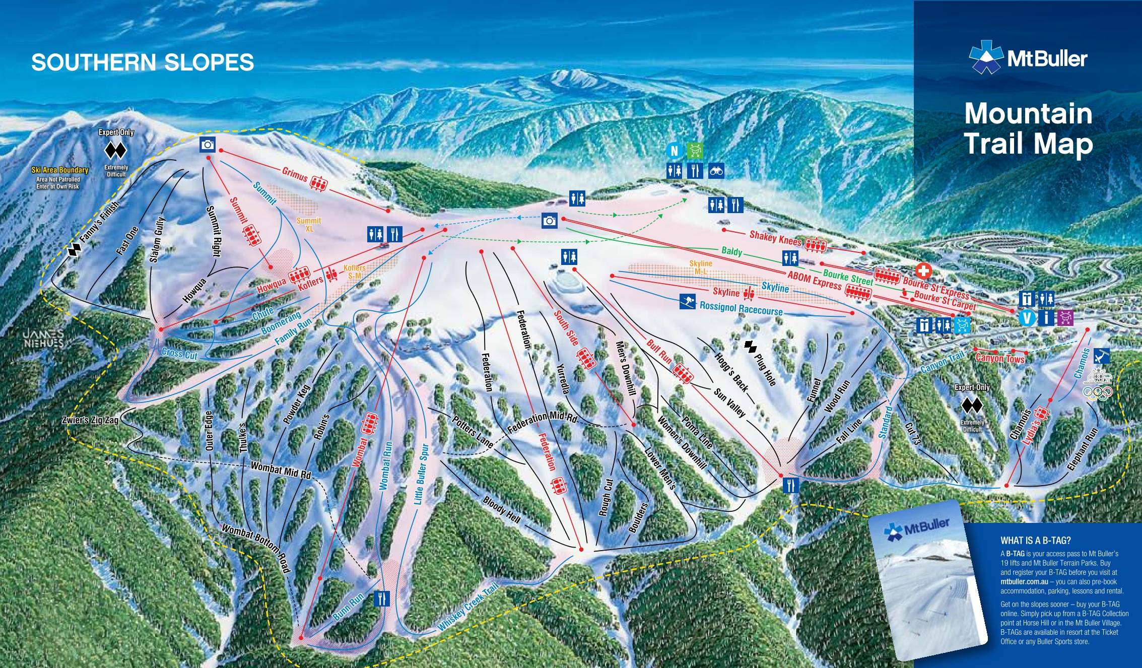 A Mount Buller síközpont 1390-1790 méter között fekszik, a szezon júniustól októberig tart. Buckapálya, funpark, halfpipe, boardercross pálya fokozza az élvezeteket. A pályák jelentős része hóágyúzott. Buller Victoria tartomány legnagyobb síterepe, javarészt eukaliptusz erdők közt kanyargó sípályákkal. A csúcs közelében már nem nőnek fák, így itt széles és részint meredek fekete pályák - köztük több buckapálya - várja a profi síelőket.