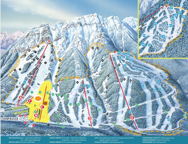 Az itt található pályák 20%-a kék, 40%-a piros, 24%-a fekete és 16%-a pedig a kanadai dupla fekete. A közelben található síközpontok közül egyedül ezen a terepen van lehetőség éjszakai síelésre.