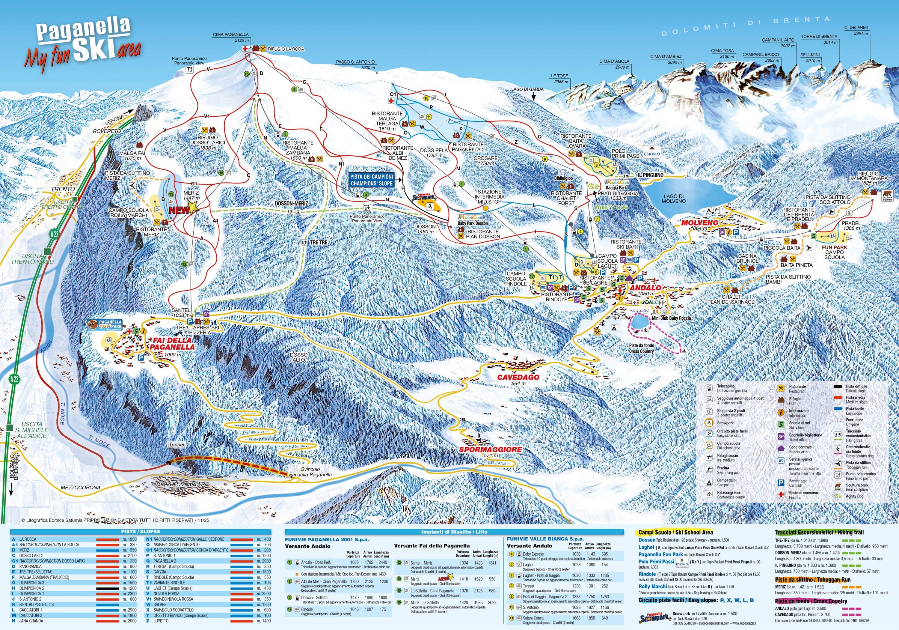 A csúcsról (ill. annak közeléből) kiindulva először fahatár feletti területeken haladnak, majd beleérkeznek az erdős részekbe. A széles, szépen kezelt lejtőkön egészen Andalóig lecsúszhatunk. A közel 40 km-es pályarendszer mindenki számára megfelelő, legyen az kezdő, profi, carvingos, boardos vagy éppen hobbisíző. A lejtőkhöz összesen 15 felvonó tartozik, ebből 11 ülőszékes, és 4 kabinos. Pályatipp: Fuoripista Tre-Tre és Panoramica.