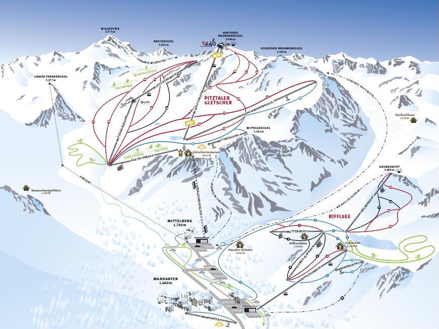 A Pitztal sírégió két részből, a gleccserből és a Rifflsee melletti pályákból áll; a két rész közvetlenül egymás mellett helyezkedik el. Jelentős különbség azonban, hogy a Pitztal gleccseren találhatóak egész Ausztria legmagasabb sípályái: 3440 méteren épült meg a hegyállomás. Ennek köszönhetően természetesen a szezon is jóval hosszabb, kb. 8 hónap egy évben, mint egy átlagos síterepen.